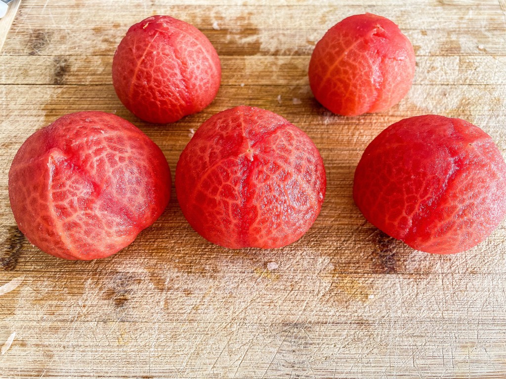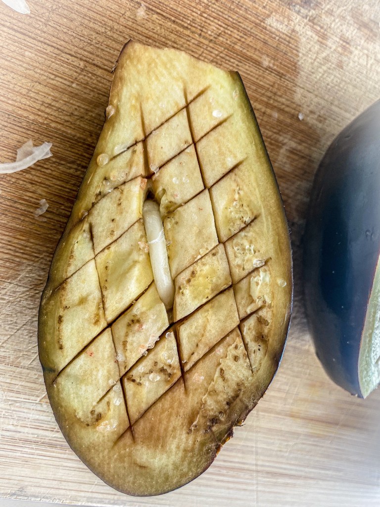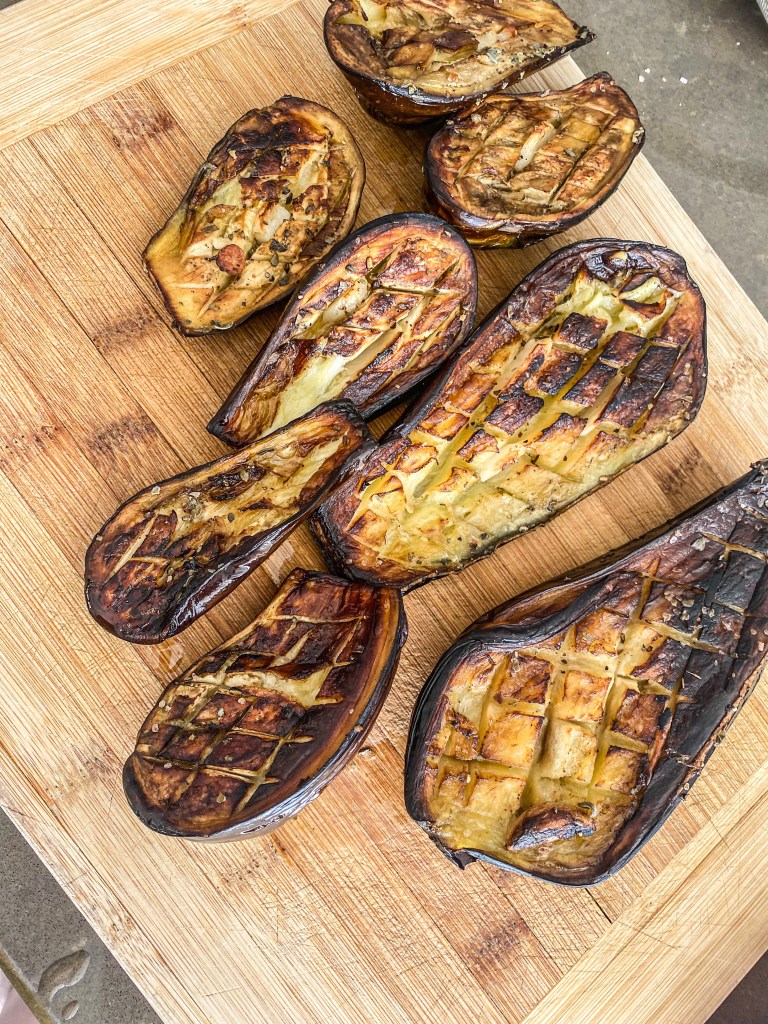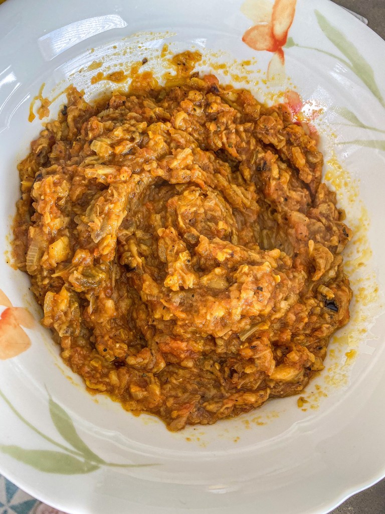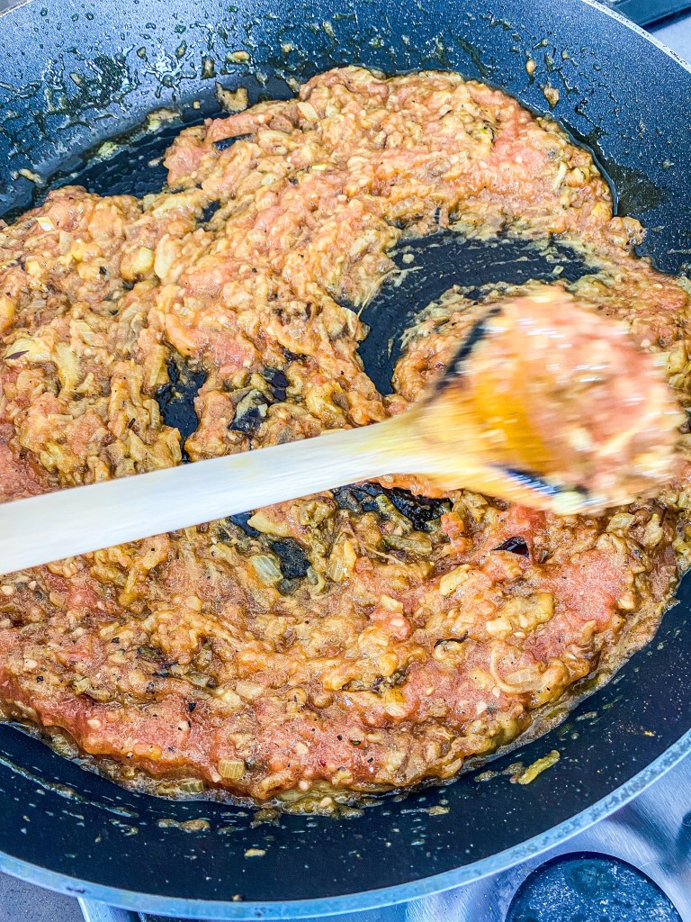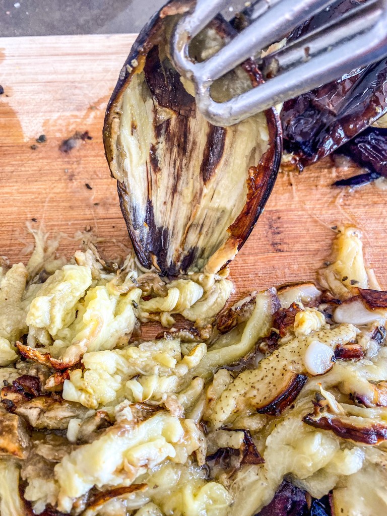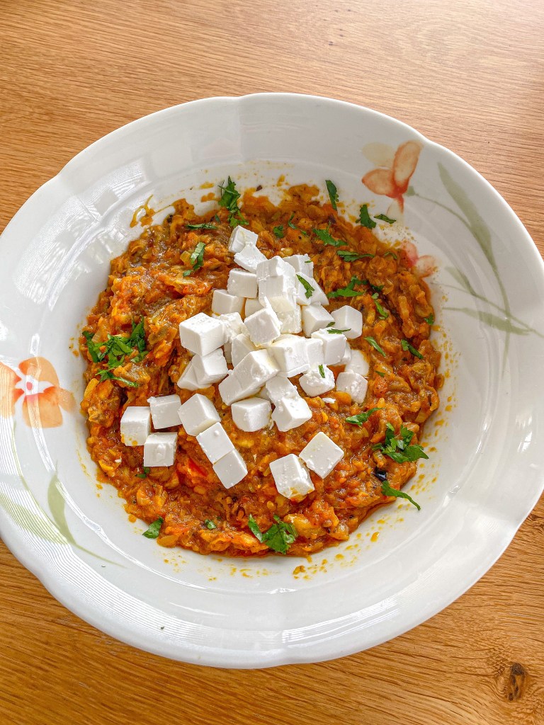 Příprava: očistíme si lilky, zbavíme je zelené části, rozpůlíme a do dužniny uděláme nožem mřížky, aby vypustily přebytečnou vodu, osolíme a směrem dužninou dolů je necháme odstát 10 minut na mřížce v troubě. Mezitím máme již uvařená rajčata tak, abychom je mohli zbavit slupky a nasekat na drobno, případně lehce umixovat. Dále máme na jemnou nakrájené 2 cibule, které lehce zasmahneme na olivovém oleji, přidáme sadu koření – sůl, pepř, kurkumu, drcený kmín, chilli. Cibulku smažíme 10 minut cca, nesmí nám černat, přidáme případně trochu oleje. Dále vytáhneme lilky, vysušíme přebytečnou vodu papírovým ubrouskem, do mřížky lilku vložíme nakrájené plátky česneku, znovu osolíme, opepříme a smažíme na rozpáleném oleji – 5 minut z každé strany, po té vložíme pánev s lilky do trouby a pečeme na 200 stupňů 15 minut. Lilky po vytažení z trouby zbavíme slupky, jinými slovy vyškrabeme dužninu lžící na prkénko a vše pěkně pokrájíme nožem, dokud nám nevznikne jemná směs lilkové dužniny – takto nakrájené vnitřky lilku přidáme na pánev k cibulce, zaprášíme vše lžičkou citronové kůry, přidáme sůl a pepř a oregáno (nebo zatar v Izraeli), přidáme drcená rajčata. Vše smažíme na středním ohni, cca 10 minut. Na závěr přidáme na ozdobu feta sýr (kozí, nesolený, nízkotučný) a na jemno nakrájený koriandr, zakapeme citronovou šťávou.