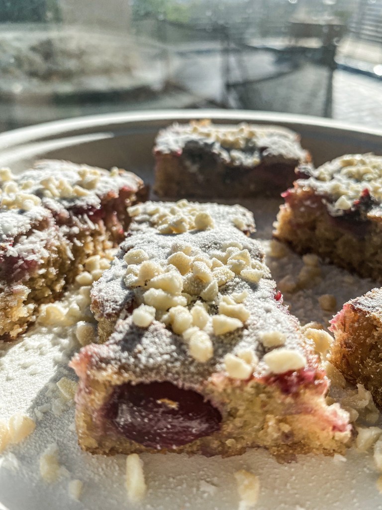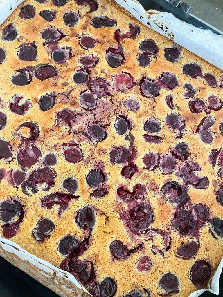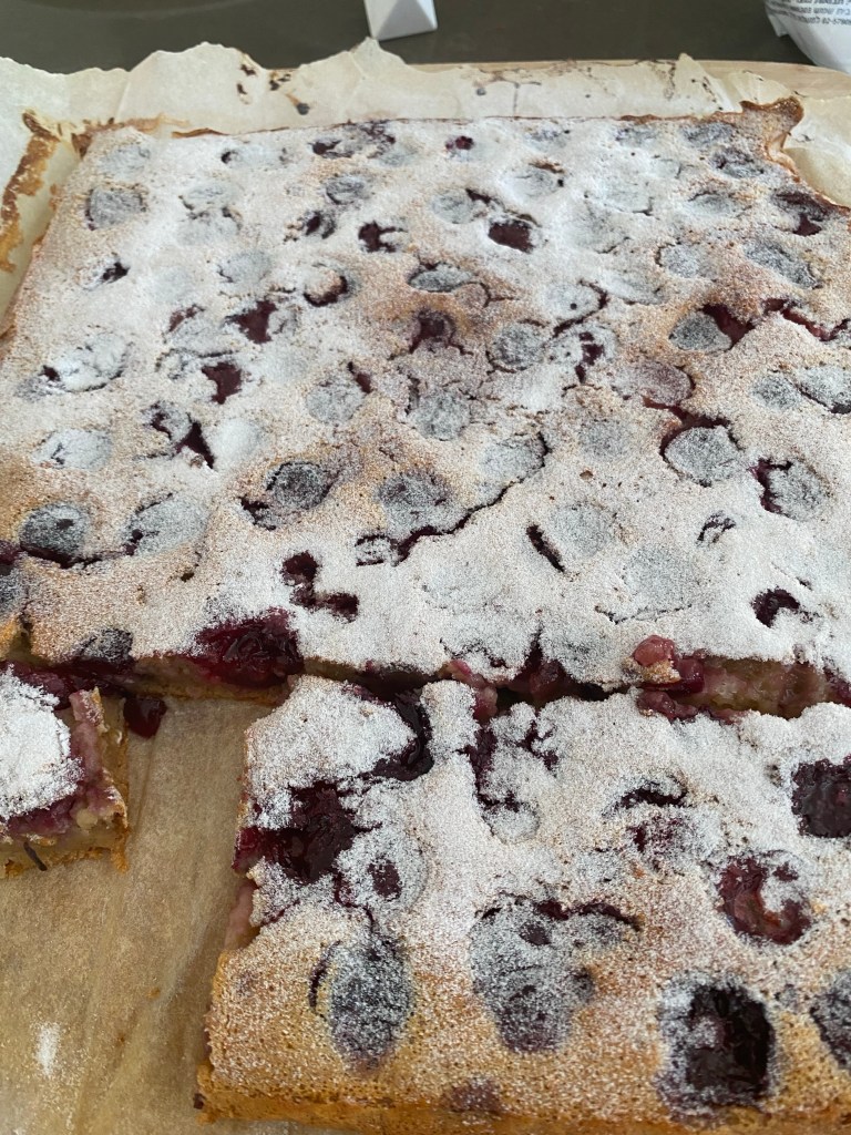 Příprava: vypeckujeme alespoň 100 g třešní. Na plech, vystlaný pečícím papírem, dáme směs, kterou připravíme následujícím způsobem: rozemeleme ovesné vločky (2 hrnečky) v mixéru spolu s kůrou z celého citrónu. Smícháme mouku a dvě vajíčka, sáček kypřícího prášku, hrneček hroznového nebo kokosového cukru, 50g rozpuštěného másla, 380 ml vlažného mléka, špetku soli, přidáme 30 ml výluhu z vanilkového lusku (můj roztok je připraven z vanilkového lusku louhovaného ve vodce), přidáme rozmíchané vločky s kůrou z citrónu. Směs by měla být tekutá.