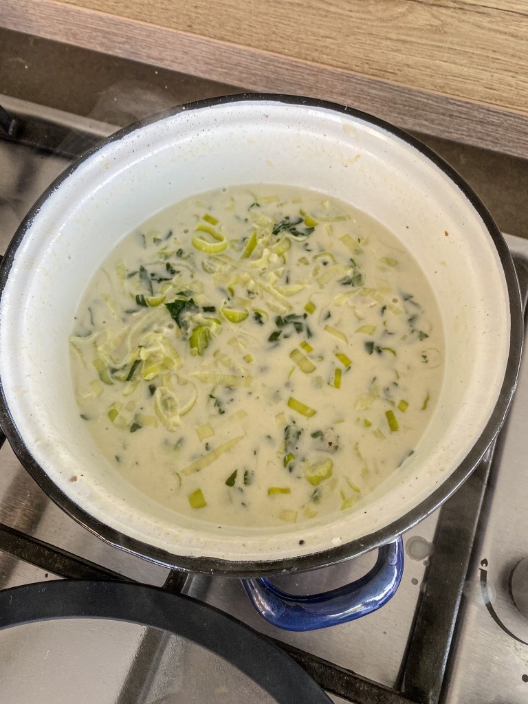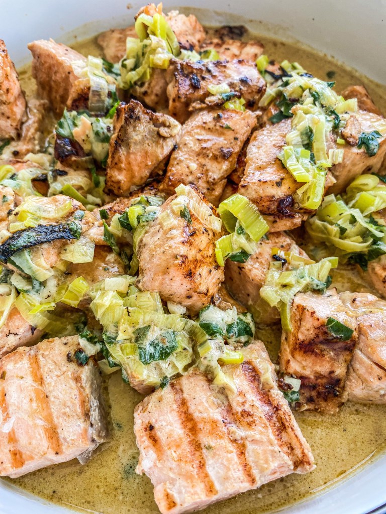 Ingredience: čerstvé listy celeru, pórek, 2 stroužky česneku, indická bazalka, malá kostička másla, sůl, pepř, kurkuma, 9% smetana na vaření, 3 lžíce sójové omáčky, čerstvý losos (nemražený)