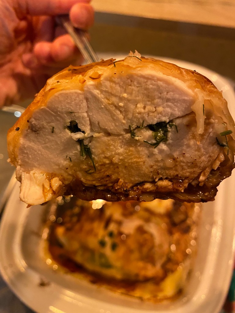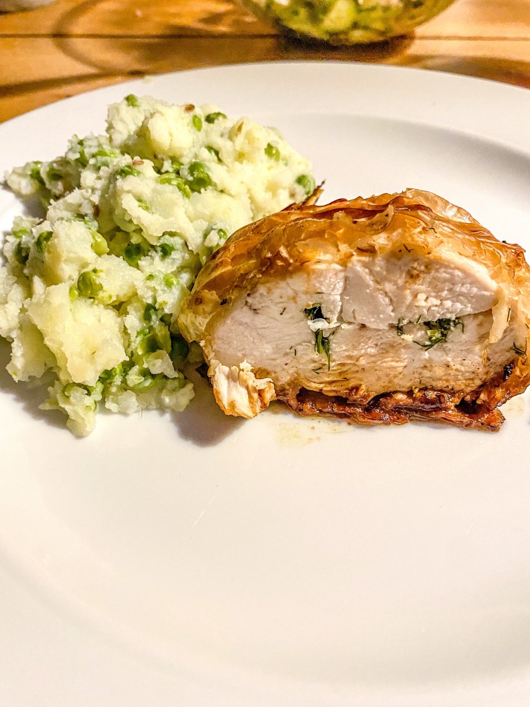 Dnes KUŘÁTKO, přesněji kuřecí prso plněné bylinkami ve filo těstu a pyré.