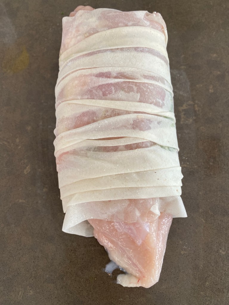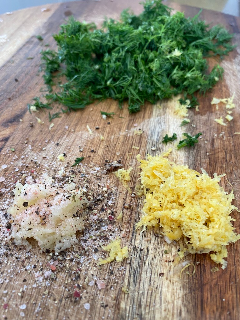 Ingredience: 3 velká kuřecí prsa, brambory, mražený hrášek, kostička másla, koriandr, kopr, sůl, pepř, citrón, balsamico, pláty těsta fila – stačí tři, česnek