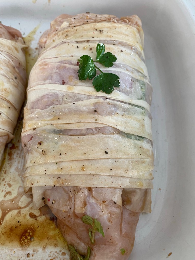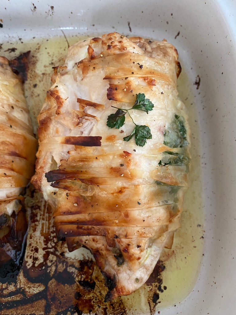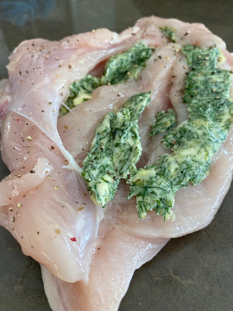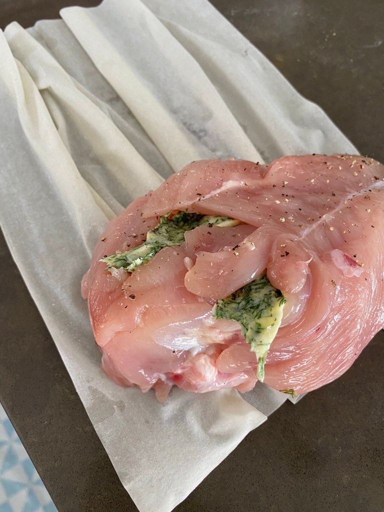 Postup přípravy: Najemno si nakrájíme bylinky, utřeme česnek se solí a pepřem nastrouháme kůru z jednoho citrónu. Dále si připravíme kuřecí prsa, ve kterých ideálně vytvoříme drážky pro plnění máslem, případně kapsu (osolíme, opepříme). Kostičku malého másla 100-150g necháme polevit na pokojovou teplotu a poté smícháme máslo s bylinkami, česnekem a citrónovou kůrou. Uválíme kuličku. Naplníme máslem kuřecí prsa a každé prso zabalíme do jednoho ručně nařaseného plátu filo těsta. Jakmile si vyložíme takto připravená kuřecí prsa na pekáček, lehce podlijeme prsa kvalitním balsamicem a kapkou olivového oleje. Pečeme v troubě cca 30-40 minut na 200 stupňů. Mezitím jsme si povařili brambory a v nich i zmrzlý hrášek, před přípravou kaše osolíme, zalijeme mlékem a přidáme malou kostičku másla. Vše rozdrtíme na kaši.