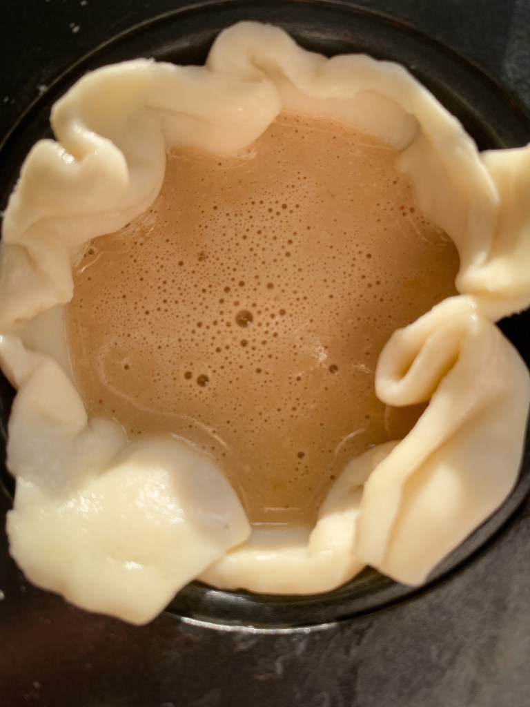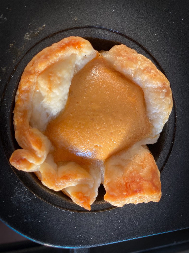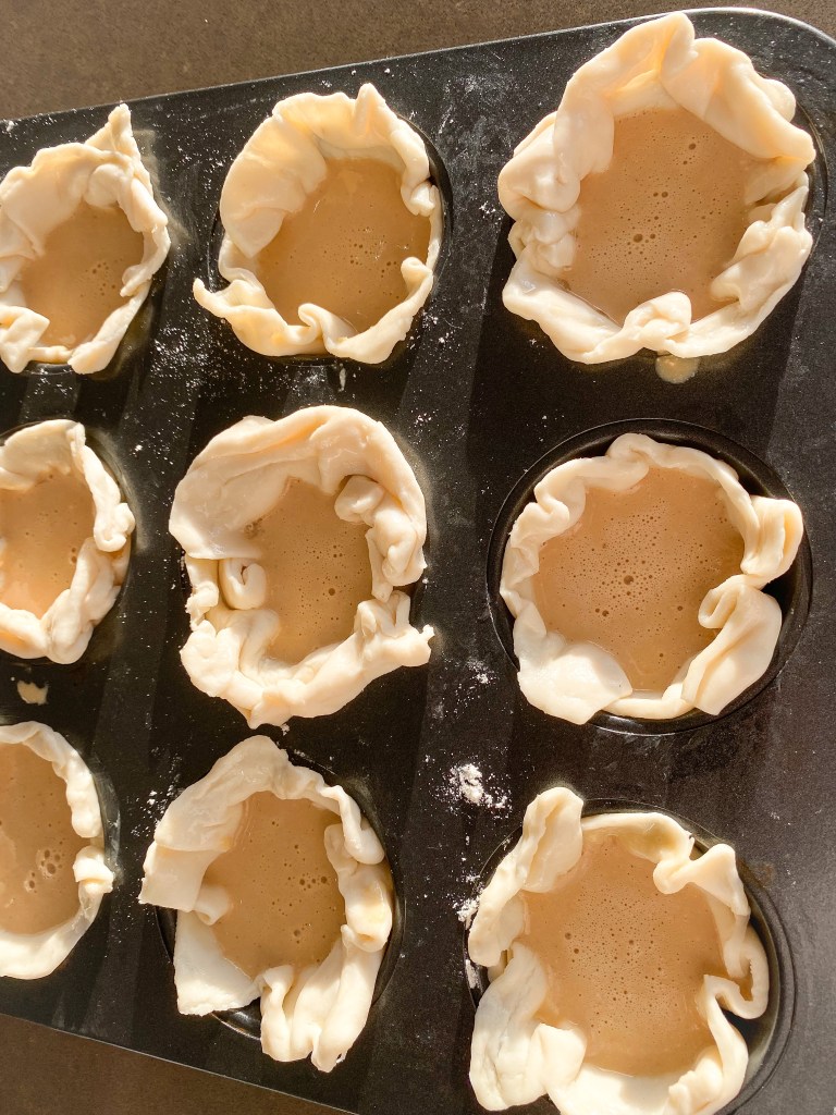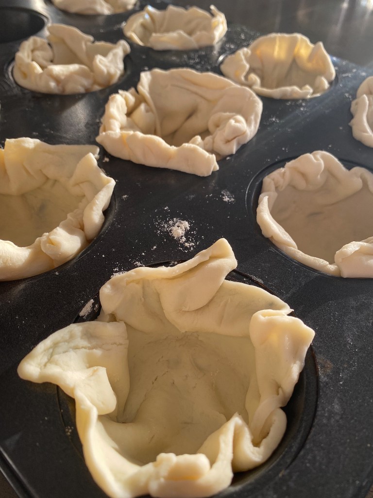 Postup: muffinový plech vytřeme rozpuštěným máslem a posypeme trochou mouky. Listové těsto rozkrájíme na čtverce a vykládáme muffinovou formu tak, že nám vždy těsto převyšuje několik centimetrů samotnou formu. Listové těsto jsem tentokrát koupila, nicméně lze připravit vlastní, recept na vlastní listové těsto budu sdílet v dalším samotném receptu na klasický štrůdl. Směs do košíčků: vyšleháme 2 žloutky a 2 vejce spolu s datlovým sirupem, přidáme tvaroh a mléko, burbon a vanilkový cukr, nakonec přidáme najemno nastrouhanou citronovou kůru. Směs nalijeme do košíčků, necháme dost místa od okrajů, neboť nám směs vzejde. Pomažeme vrch těsta bílky a zapékáme 20 minut na 180 C dozlatova.