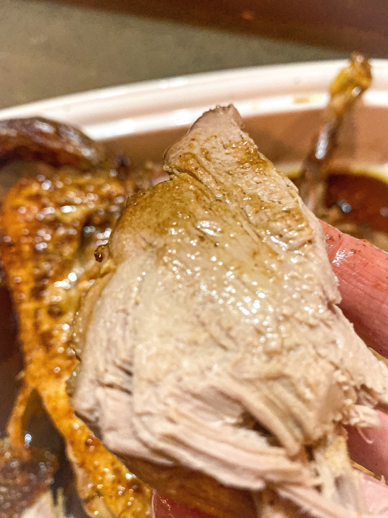 Postup: kachničku si připravíme den před samotným pečením, nařízneme kůži aby kachna vypustila lehce tuk při pečení, do kachny dáme jednu celou cibuli, 6 stroužků česneku a čerstvý rozmarýn. Takto připravenou kachnu dáme na noc “odpočinout” do lednice, zakryjeme. V den pečení kachničku posadíme na mřížku, aby se nedotýkala pečícího plechu a tuk mohl hezky odkapávat. Dáme na 3,5 hodiny do trouby. Zhruba 3 kachnu vytáhneme během pečení a podlijeme výpekem. Před posledním podlitím, kachnu na chvíli na mřížce odtavíme stranou, plech s výpekem dáme vařit na sporák na cca 3 -4 minuty a podlijeme 300 ml bílého vína, tento postup je zásadní, protože víno a výpek vytvoří vynikající chuť. Podlijeme kachnu a dáme dopéct na posledních 15 minut. Mezitím uvaříme 6 velkých brambor, které po vycházení nastrouháme, přidáme 1 vejce, hladkou mouku a semolinu, 2 lžičky soli a uhněteme těsto na bramborový knedlík. Knedlík vaříme cca 15-20 minut na mírném ohni ve vodě, která nebublá zprudka. Dále nakrájíme červené zelí, 2 cibule na velmi jemno, cibuli restujeme do zlatova, přidáme sůl, pepř, muškátový oříšek (strouhaný), přidáme nakrájené zelí, 100 ml výpeku, 100 ml vína, 150 ml BIO datlového sirupu (to je naprostá pecka místo použití cukru), posledním přídavkem je skořice, buď jako prášek nebo lze přidat 3 tyčky a povařit v zelí. Doprostřed zelí posadíme rukou rozmáčknutý stroužek česneku. Vaříme cca 45 minut a v průběhu podléváme vodou, pokud je potřeba. Zelí je možné vařit klidně déle dle potřeby a chuti.