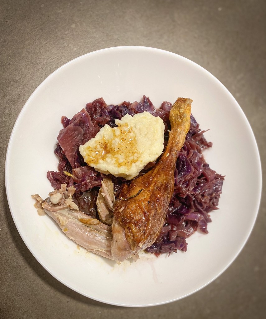 Ingredience: kvalitní kachna, 3 cibule, čerstvý rozmarýn, 8 stroužků česneku, sůl, pepř, 300 ml dobrého bílého vína (já použila suché Chablis), 6 velkých brambor, 1 vejce, 400g hladké mouky, 150g semoliny (náhrada za polohrubou mouku), kmín, muškátový oříšek, skořice, BIO datlový sirup, bobkový list.