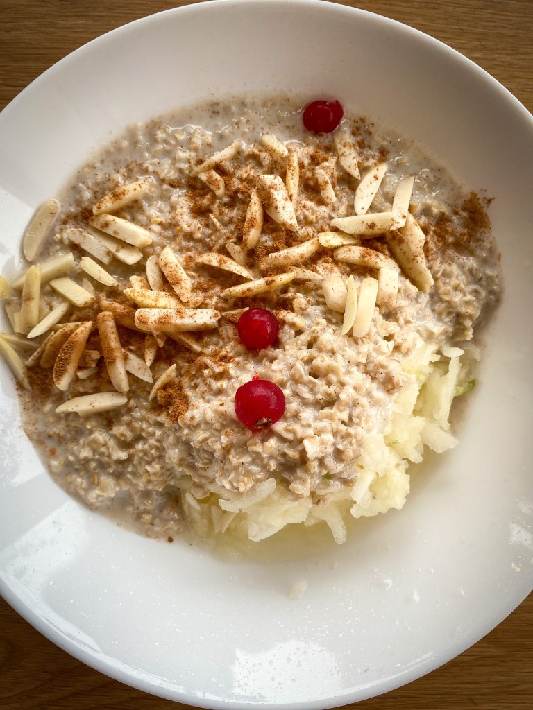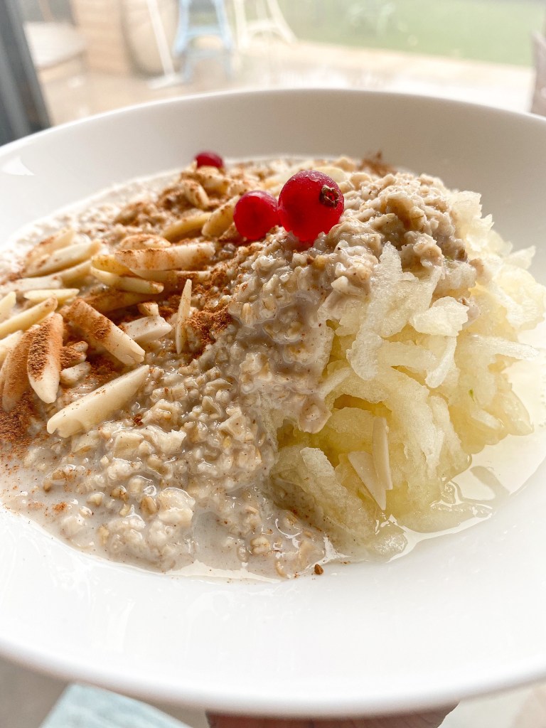 Ingredience: ovesné vločky cca 150-200g (já používám bez lepku), nastrouhané jablko (buď syrové nebo povařené, lze i pečené v troubě), tady je syrové. Dále 300 – 400 ml mléka, lžíce domácího medu, skořice, nasekané loupané mandle nebo vlašské ořechy, strouhaný kokos, ovoce dle libosti – rybíz, borůvky, jahody, cokoliv…