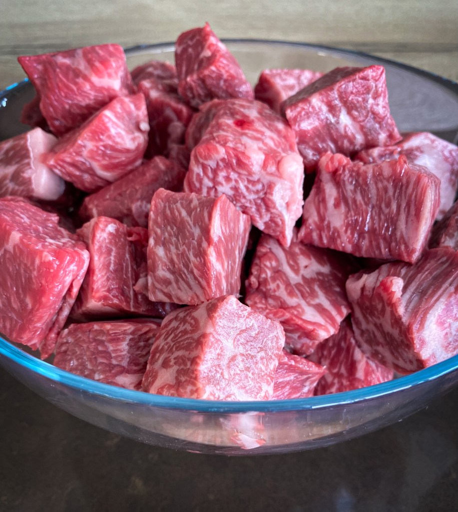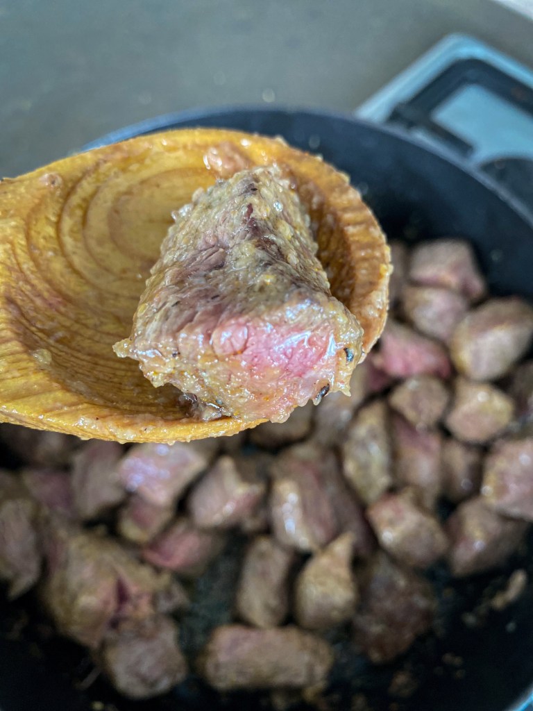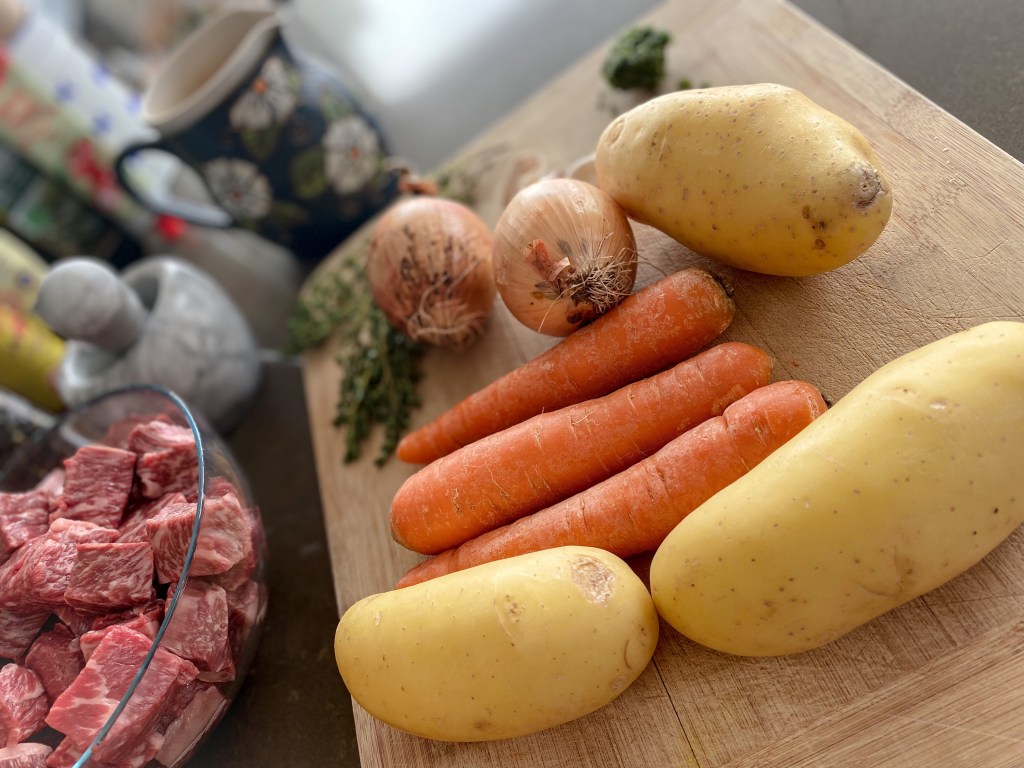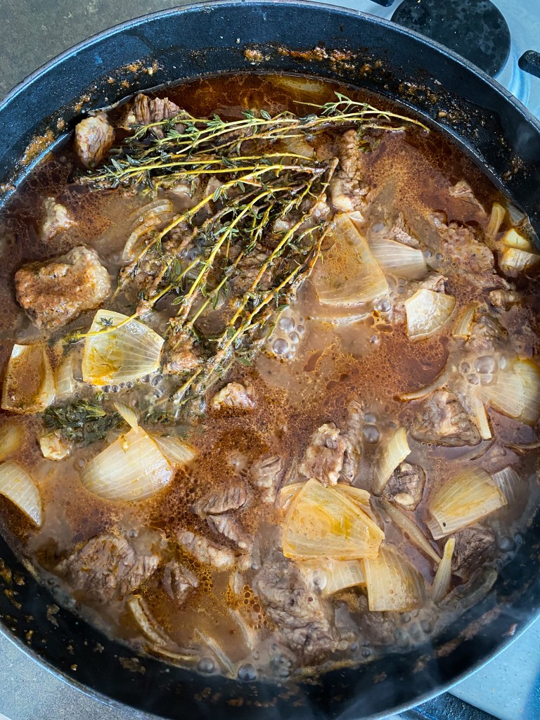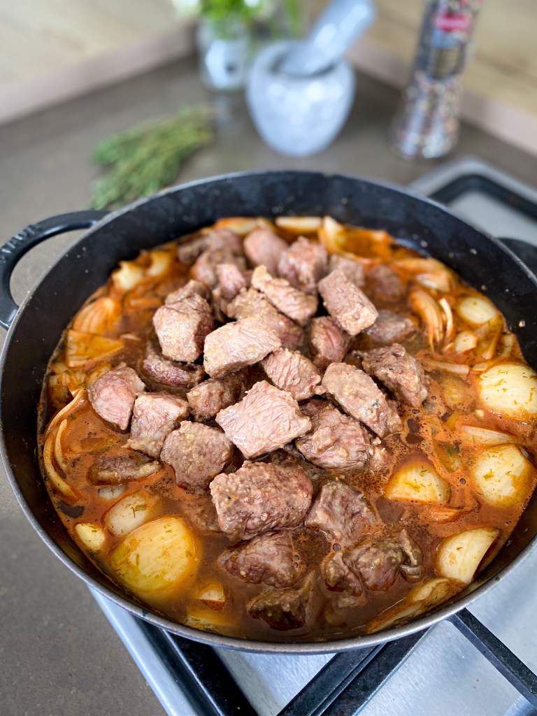 Jdeme na to 🙂 – postup přípravy: Nakrájenou kližku na kostičky si lehce obalíme v mouce, která je již smíchaná se solí, pepřem a kurkumou. 2 minuty zasmahneme na pánvi, ve které rozpálíme 4 lžíce olivového oleje. Smažíme na prudkém ohni tak, aby se nám maso zatáhlo a při dalším vaření udrželo uvnitř masa šťávu. Maso vyjmeme z pánve a posadíme ho stranou. Do výpeku přidáme lžíci až dvě olivového oleje, cibuli nakrájenou na čtvrtky, rajčatovou pastu, česnek a kopr a balsamikový ocet. Vše dobře promícháme a smažíme cca 1-2 minuty. Přidáme 1,5 litru vývaru. Maso vrátíme k varu a přidáme větvičky tymiánu. Zakryjeme pokličkou a vaříme cca 1,5 až dvě hodiny. Před koncem přidáme 2 nakrájené mrkve, cca na posledních 10-15 min. Stále hlídáme dostatek vody, dle potřeby dolijeme a přidáme sůl a pepř.
