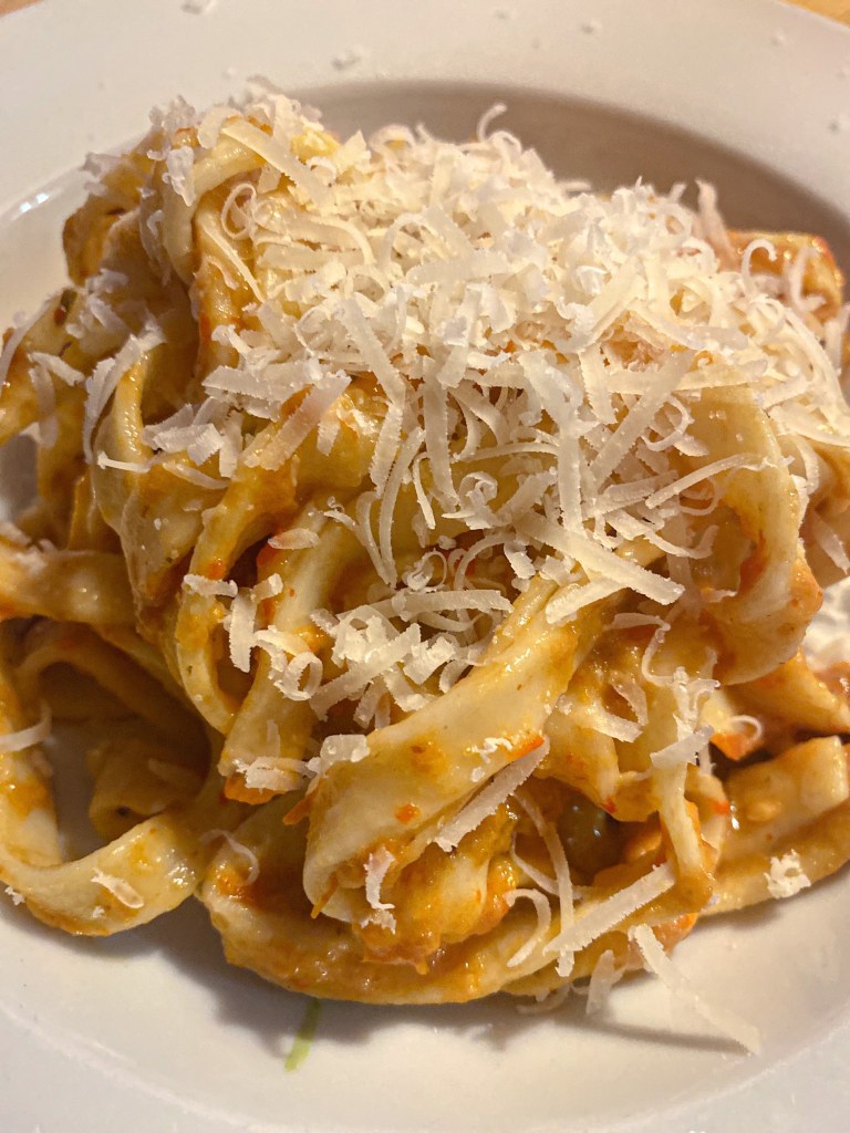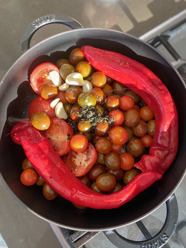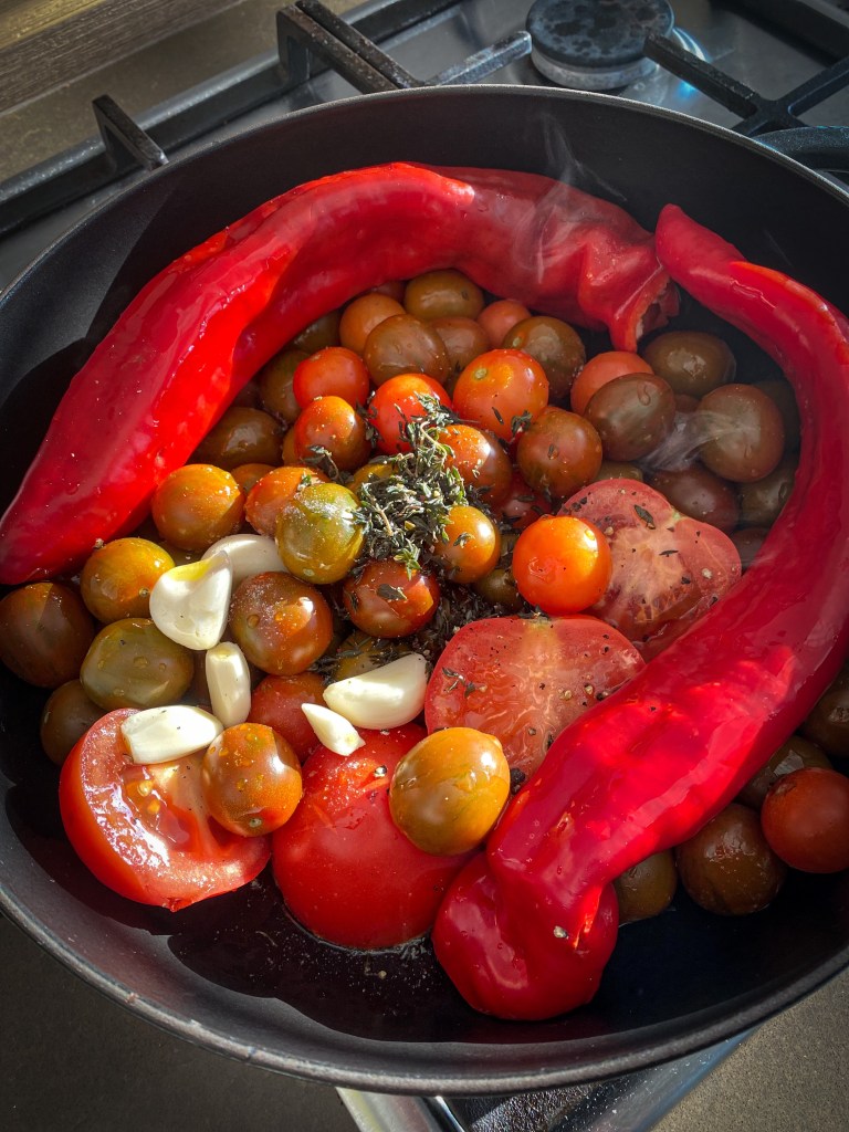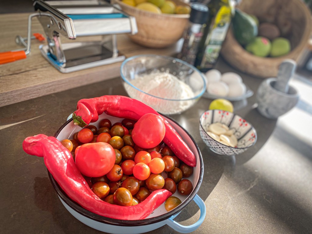 Jeden z nejpracnějších, ale zároveň chuťově nejlepších receptů je tento. Větší kulinářskou romantiku si nedovedu představit než ruční zpracování těsta, přípravu těstovin ručním strojkem a pečení rajčátek v troubě, stříhání bylin na zahrádce a v neposlední řadě večeře při západu slunce.
