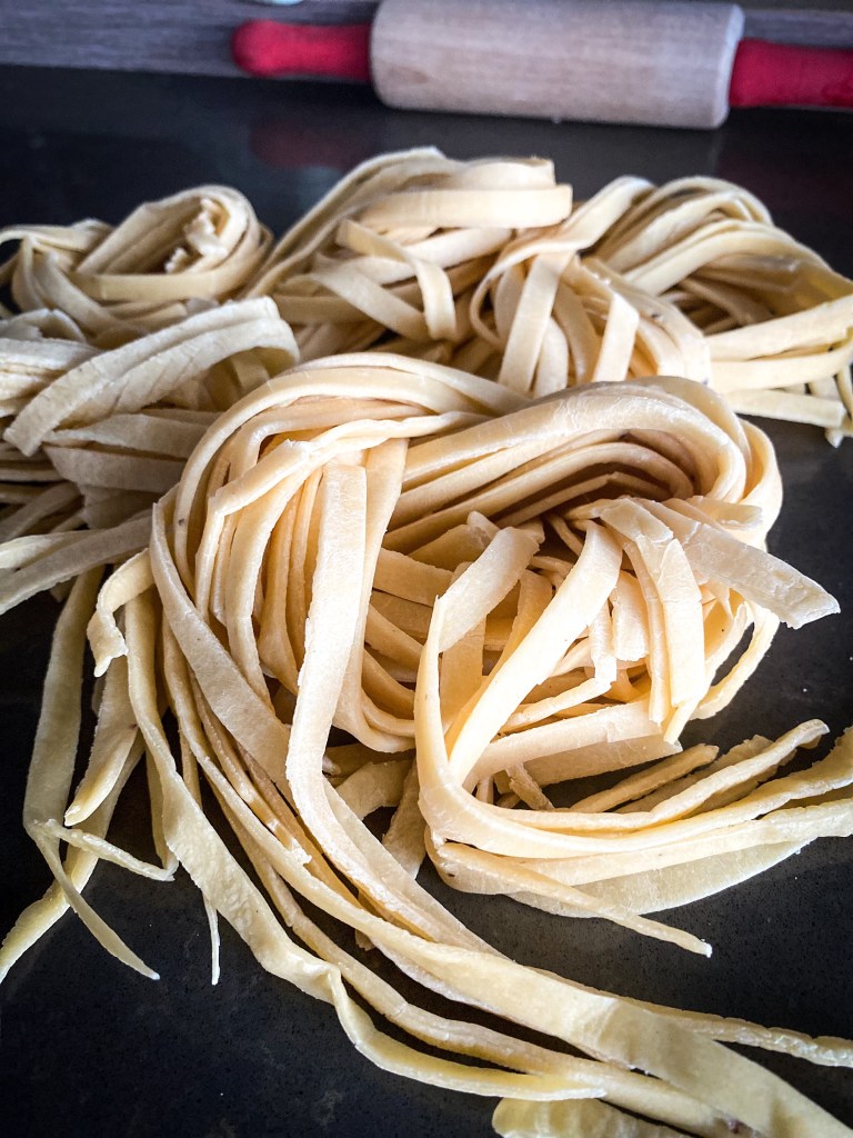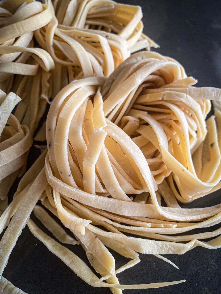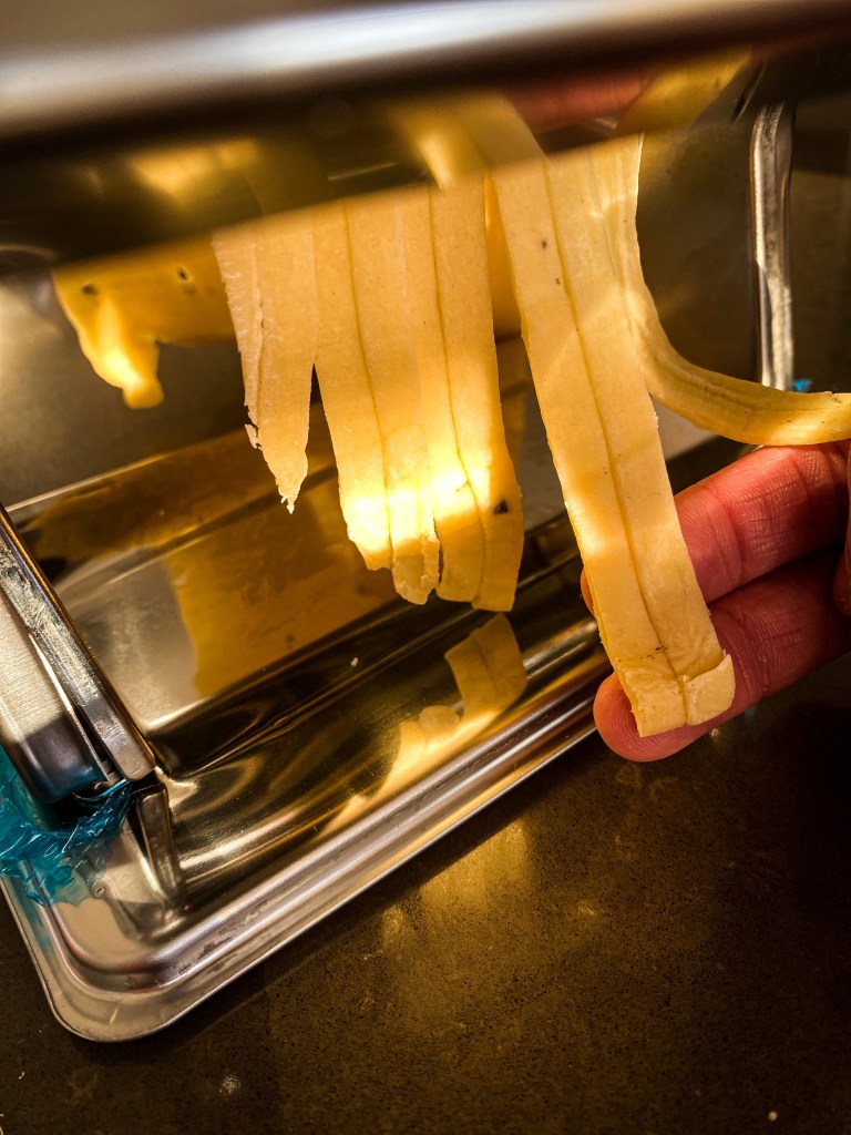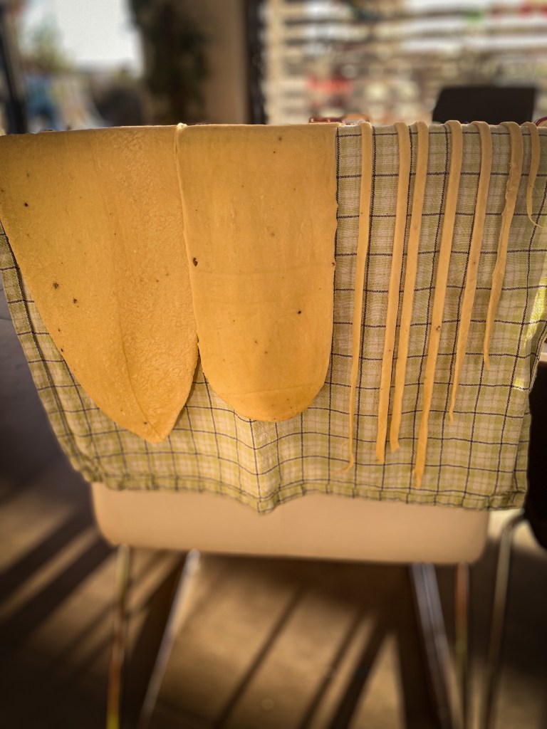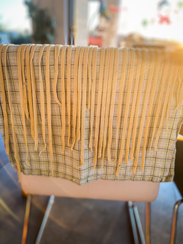 Kuličku těsta rozdělíme na 4 díly. Každý rozválíme válečkem na velmi tenké pláty, které dále prolisujeme skrz strojek na těsto na 1-2 cm široké pláty. Pláty necháme lehce proschnout na utěrce a na teplém místě. Cca 10-15 minut. Jakmile proschnou prolisujeme znovu strojkem na nudle. Nudle opět rozložíme na utěrku a necháme proschnout. Cca 5 minut. Z takto připravených nudlí buď uděláme nudlové uzly nebo je v této podobě uvaříme jako samotné nudle. Vaříme ve vroucí osolené vodě s olivovým olejem po dobu 5 -7 minut.