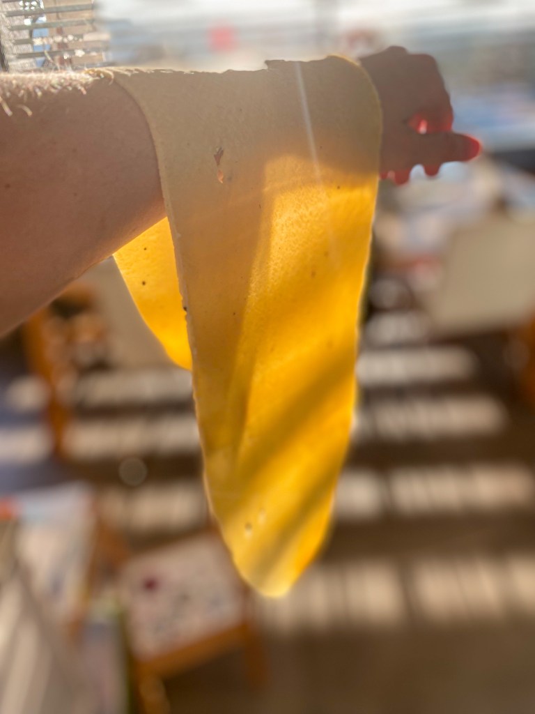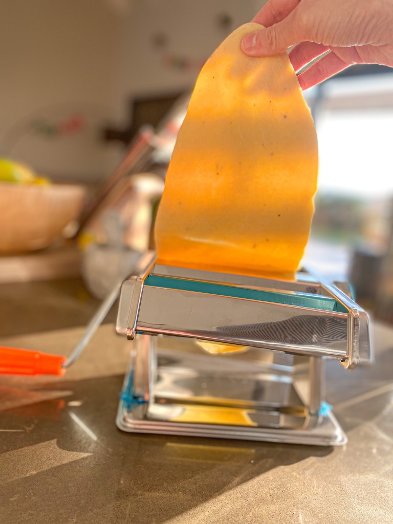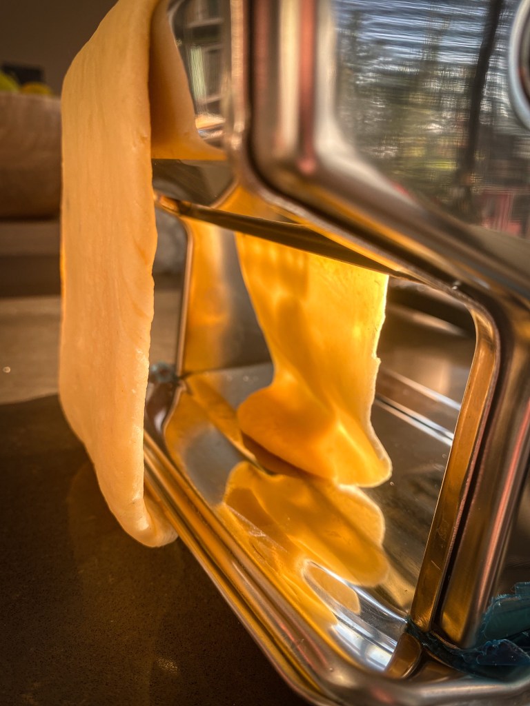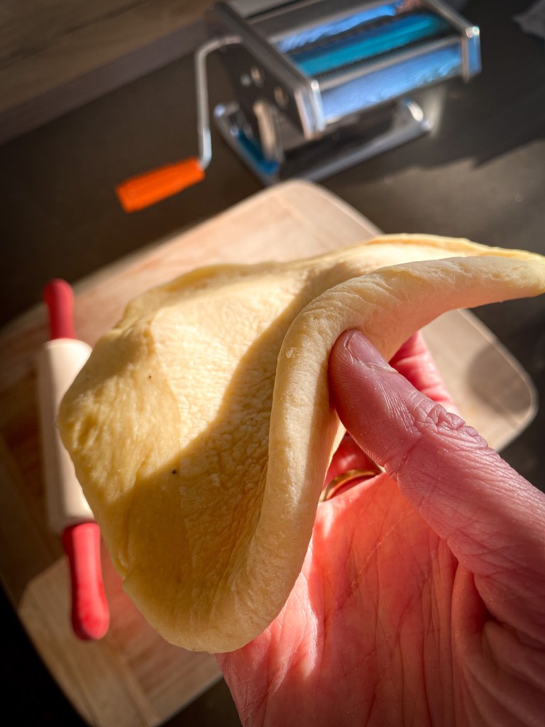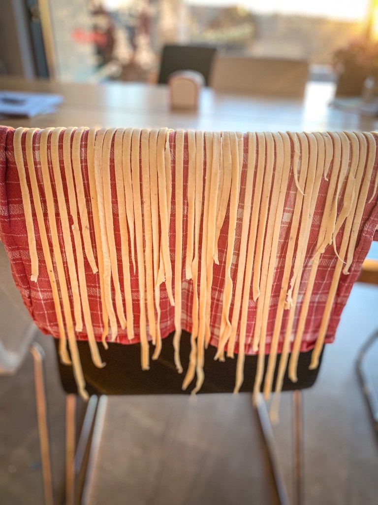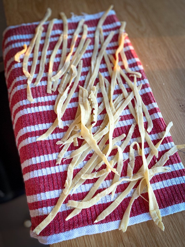 Kuličku těsta rozdělíme na 4 díly. Každý rozválíme válečkem na velmi tenké pláty, které dále prolisujeme skrz strojek na těsto na 1-2 cm široké pláty. Pláty necháme lehce proschnout na utěrce a na teplém místě. Cca 10-15 minut. Jakmile proschnou prolisujeme znovu strojkem na nudle. Nudle opět rozložíme na utěrku a necháme proschnout. Cca 5 minut. Z takto připravených nudlí buď uděláme nudlové uzly nebo je v této podobě uvaříme jako samotné nudle. Vaříme ve vroucí osolené vodě s olivovým olejem po dobu 5 -7 minut.