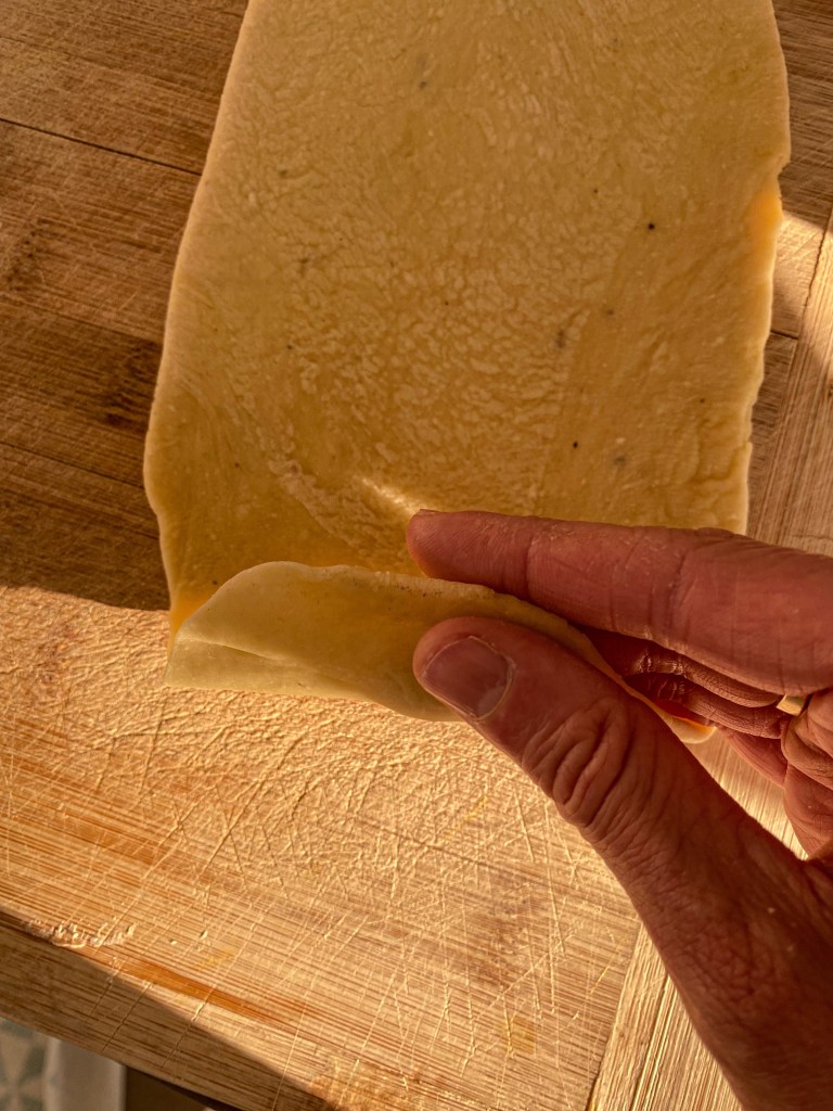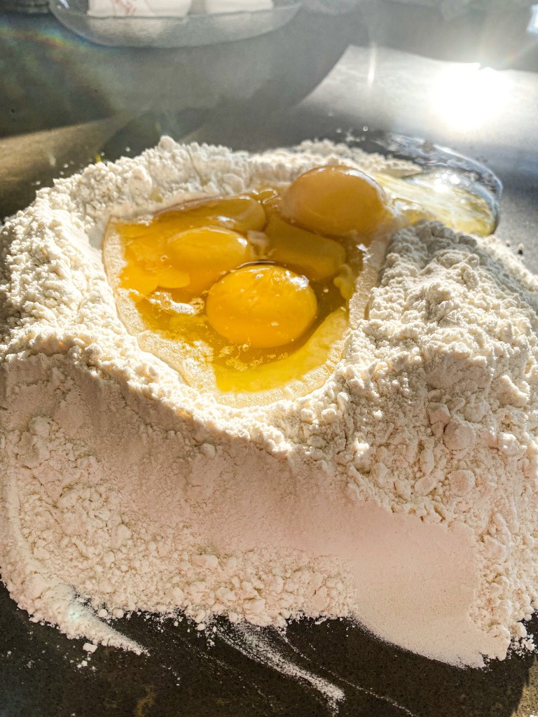 Na čistou pracovní plochu vysypeme mouku. Uprostřed utvoříme “kráter”, aby se nám dovnitř vešla vajíčka. Přidáme k nim citronovou šťávu, sůl a pepř. Vše dobře promísíme a začneme zpracovávat těsto. Přidáme olivový olej. Těsto hněteme a natahujeme, hněteme a opět natahujeme, dokud není celistvé. Těsto nesmí lepit, ani se trhat, nesmí se rozpadat. Hotové těsto necháme 30 minut odležet na suchém místě. Zakryjeme utěrkou.