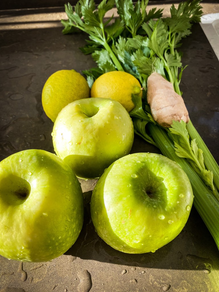 Ingredience: BIO řapíkatý celer (potřebujeme celý svazek), 1-2 malé BIO limetky, 3 sladká zelená jablka, kořen zázvoru