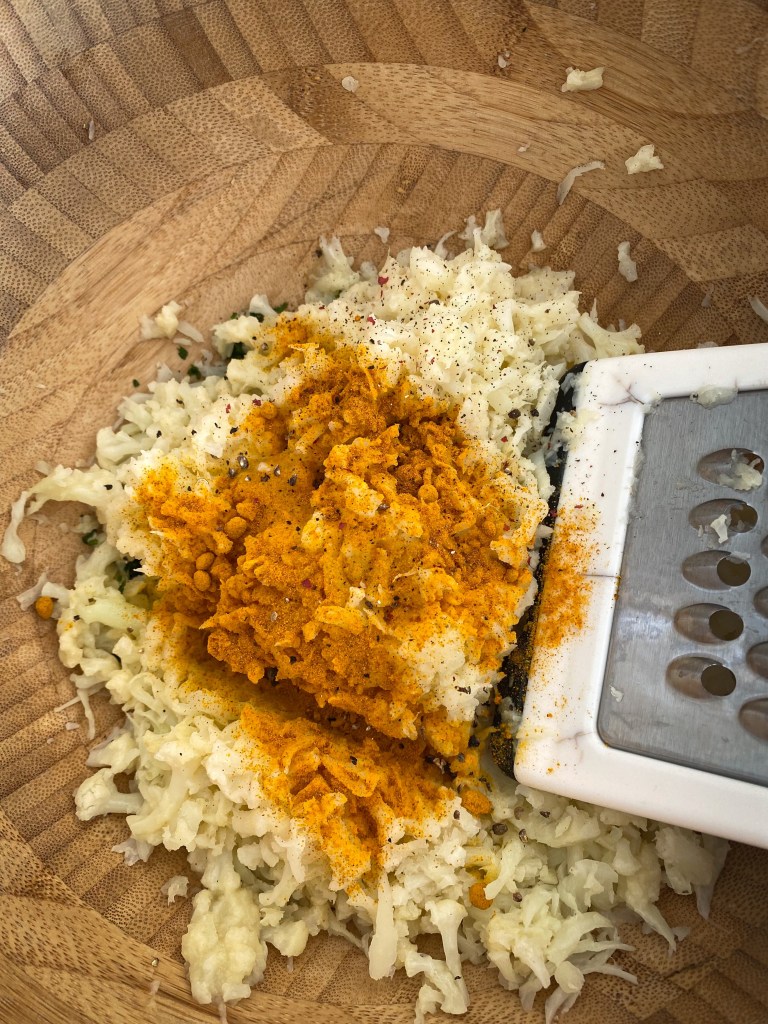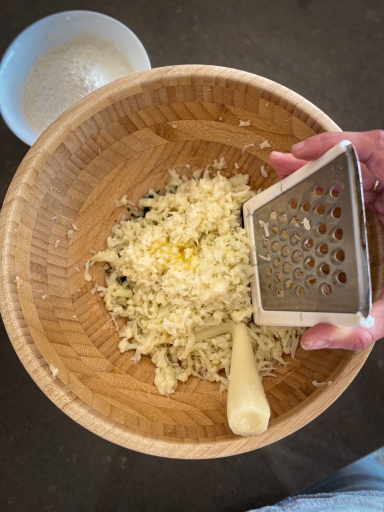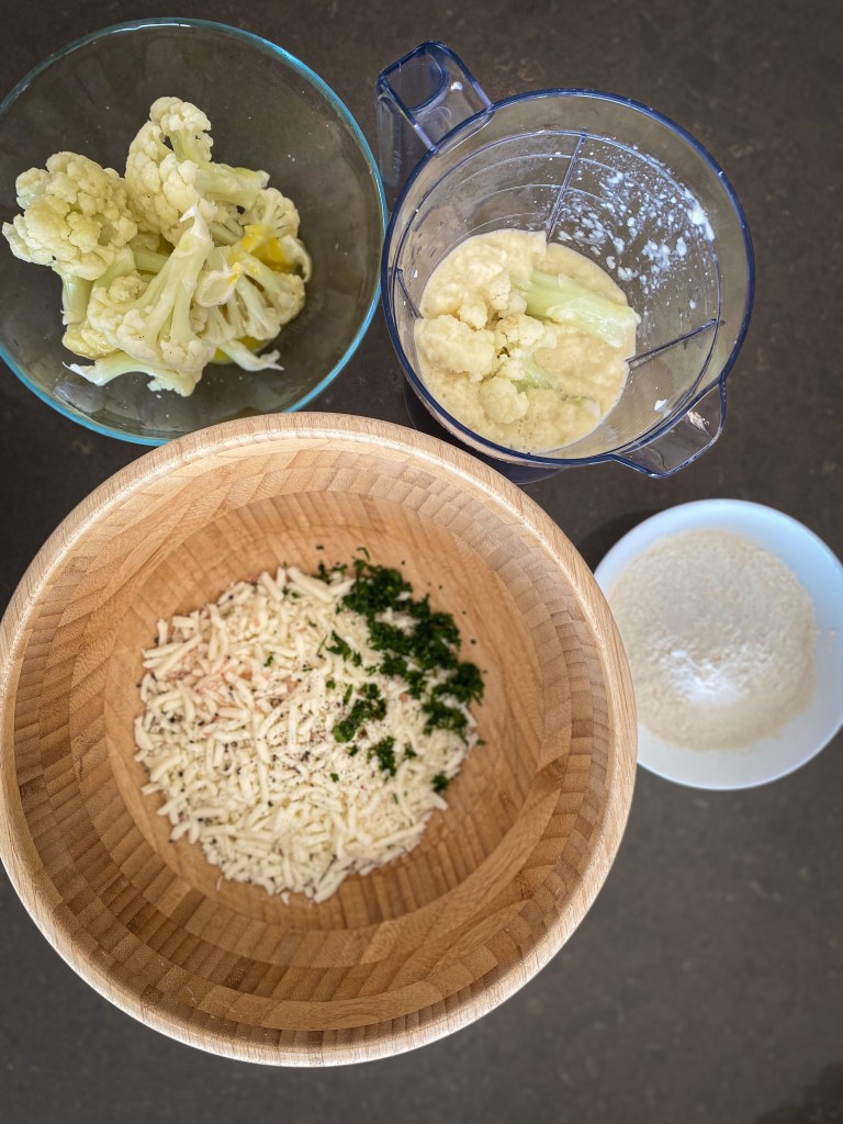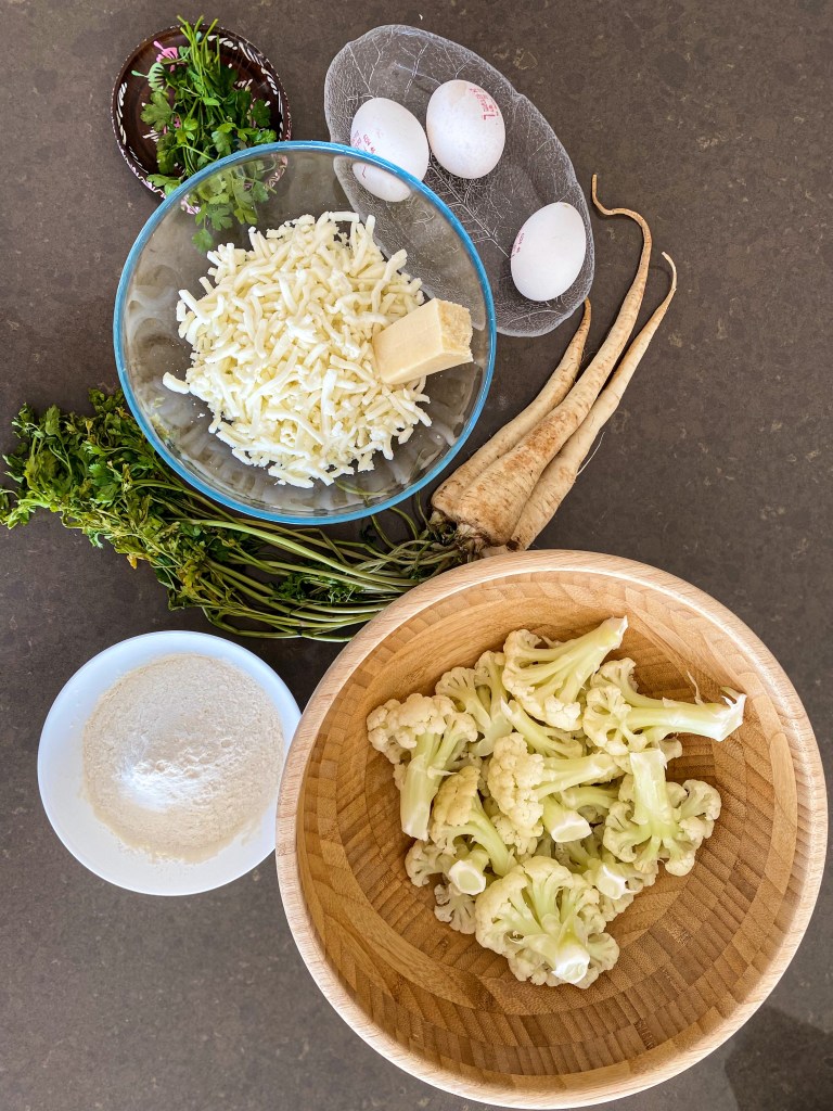 Květák a kořeny petržele dobře očistíme a necháme změknout v páře, cca 8-10 minut. Mezitím si do velké misky připravíme nastrouhaný sýr mozarella a parmezán. Přidáme najemno nakrájenou petrželku a směs koření – kurkumu, sůl a pepř, velmi málo muškátového oříšku. Do této směsi přidáme 2 vejce. Nežli se pustíme do míchání ingrediencí, nastrouháme do misky, v páře, uvařený květák a kořeny petržele. Jako poslední přidáme 2 lžíce rozemletého květáku na kaši (přidávám takto pro stmelení hmoty) a 50g mouky. Vše dobře promícháme a vytváříme malé bochníčky, které vyskládáme na plech s pečícím papírem. Nakonec potřeme bochníčky lehce olivovým olejem a posypeme lehce muškátovým oříškem. Pečeme do zlatova, cca 30-35 minut na 200 stupňů Celsia.