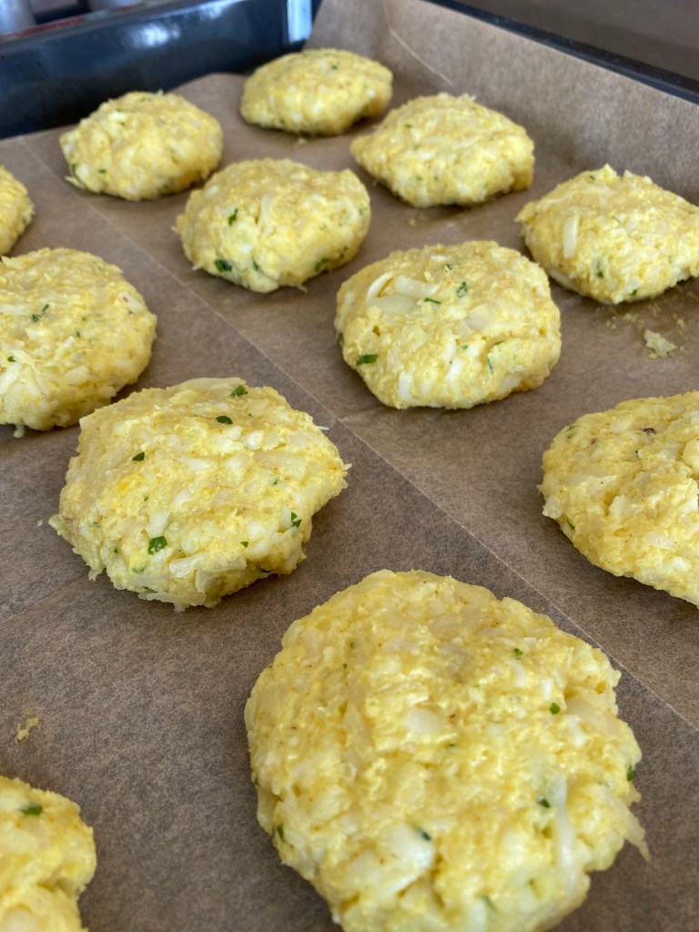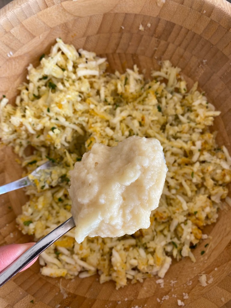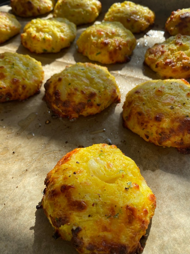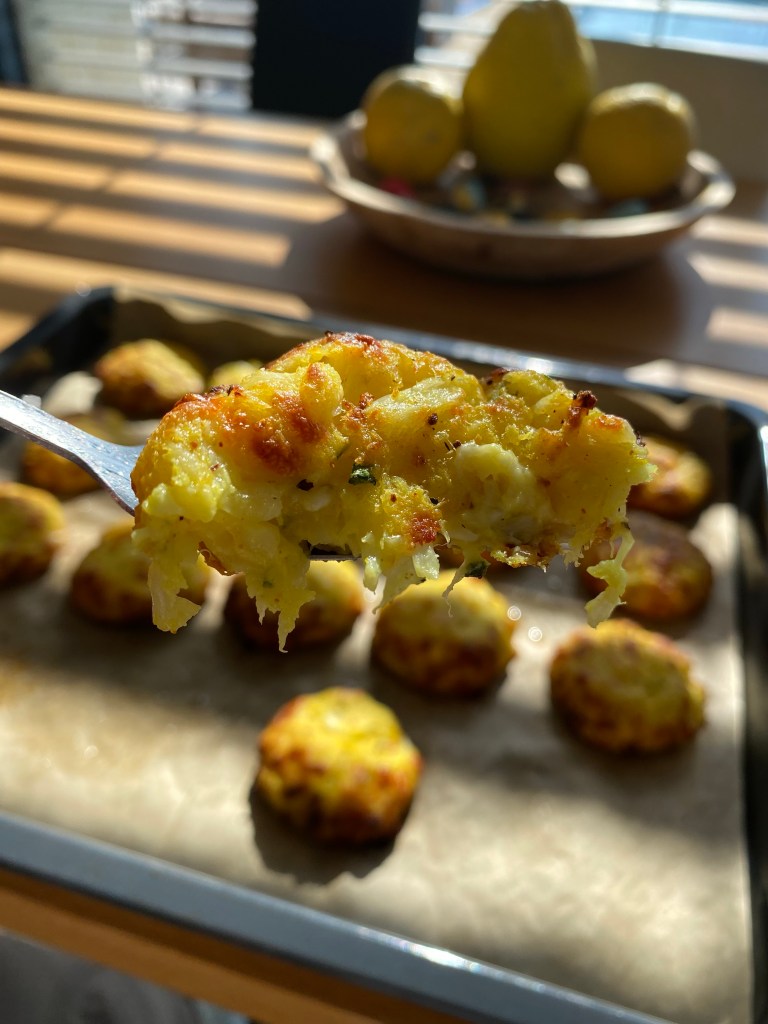 Květák a kořeny petržele dobře očistíme a necháme změknout v páře, cca 8-10 minut. Mezitím si do velké misky připravíme nastrouhaný sýr mozarella a parmezán. Přidáme najemno nakrájenou petrželku a směs koření – kurkumu, sůl a pepř, velmi málo muškátového oříšku. Do této směsi přidáme 2 vejce. Nežli se pustíme do míchání ingrediencí, nastrouháme do misky, v páře, uvařený květák a kořeny petržele. Jako poslední přidáme 2 lžíce rozemletého květáku na kaši (přidávám takto pro stmelení hmoty) a 50g mouky. Vše dobře promícháme a vytváříme malé bochníčky, které vyskládáme na plech s pečícím papírem. Nakonec potřeme bochníčky lehce olivovým olejem a posypeme lehce muškátovým oříškem. Pečeme do zlatova, cca 30-35 minut na 200 stupňů Celsia.