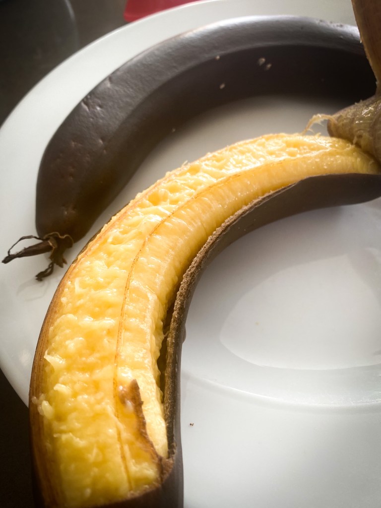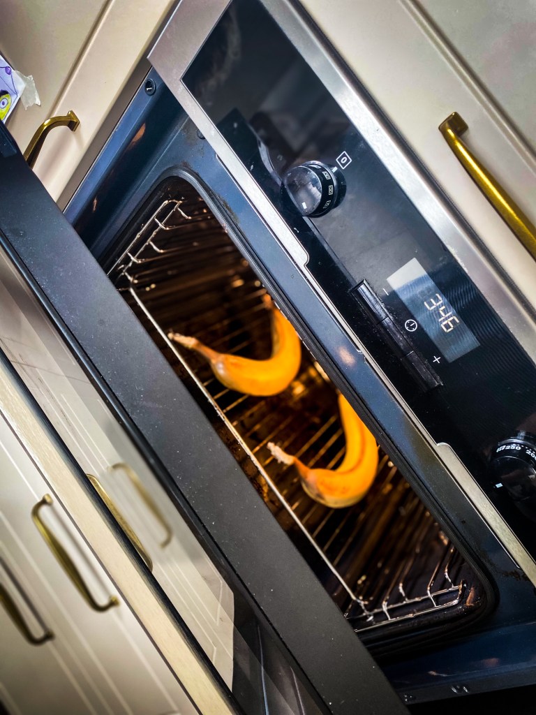 Pokud nemáme měkké banány, které jsou pro tento recept zásadní, dáme banány do trouby na cca 10 minut, pečení na 200 stupňů Celsia. Slupka banánu během této doby zhnědne a banán je krásně měkký.