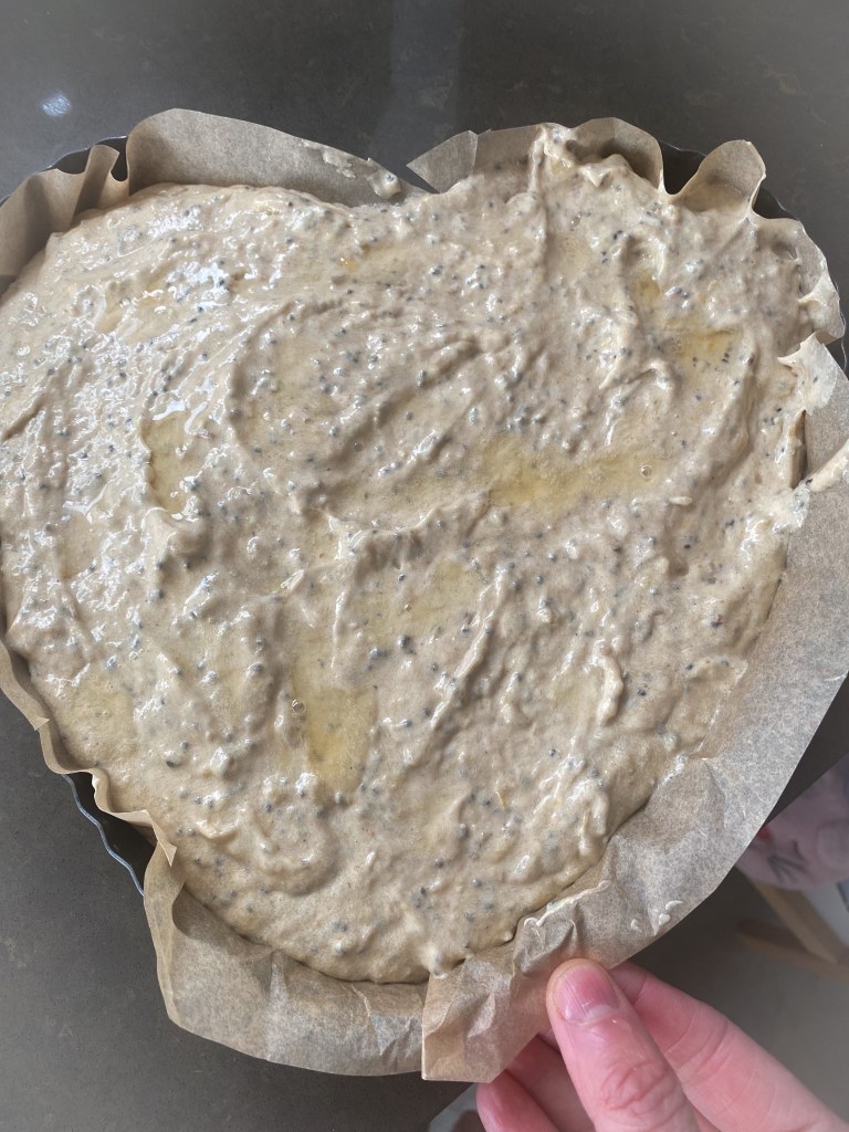Do mixéru dáme mouku, sůl, skořici a vanilkový cukr – ingredience krátce, ale dobře promícháme. Dále přidáme vejce, datlový sirup, kůru z citrónu, šťávu z pomeranče, smetanu a rozpuštěné máslo, banány a mícháme dokud se těsto nespojí. Naposledy přidáme vanilkový lusk, chia semena a vlašské ořechy. Dobře propracujeme.
