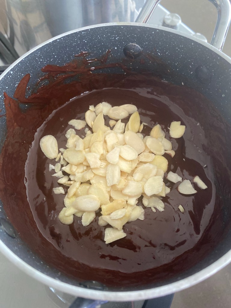 Polevou polijeme vrch banánového chleba a posypeme mandlovými lupínky.