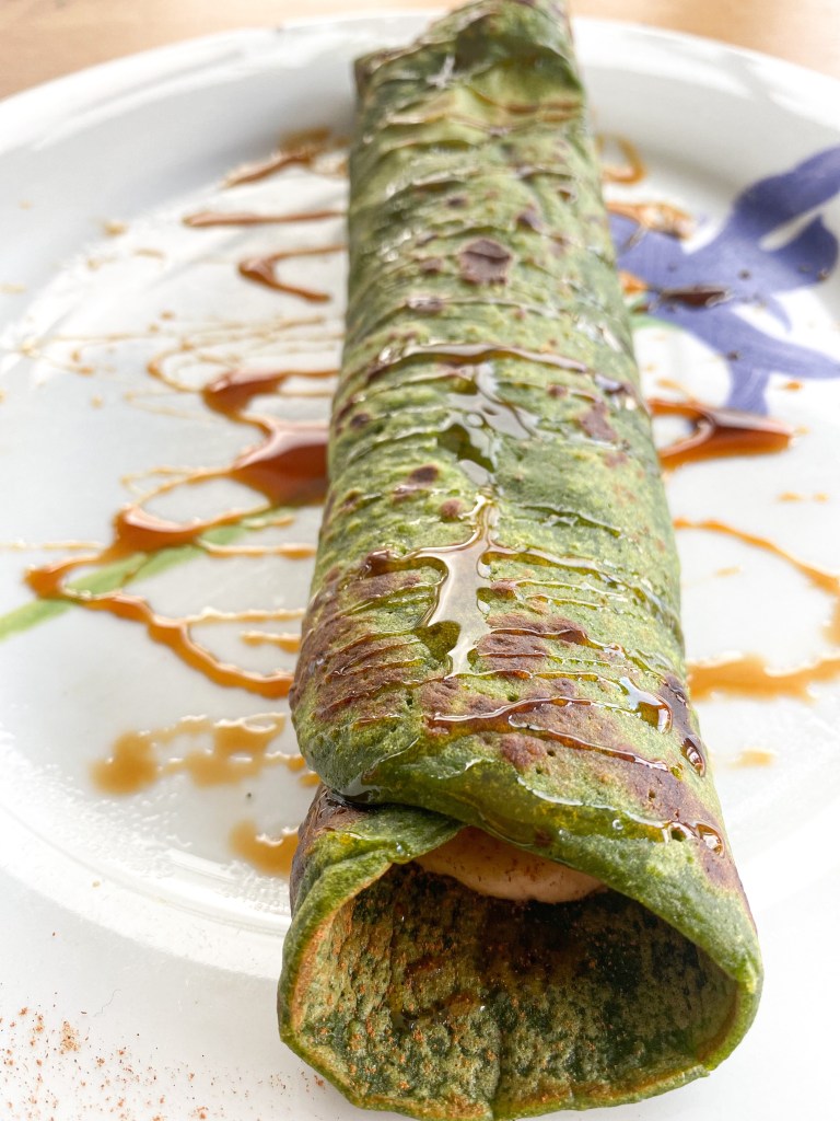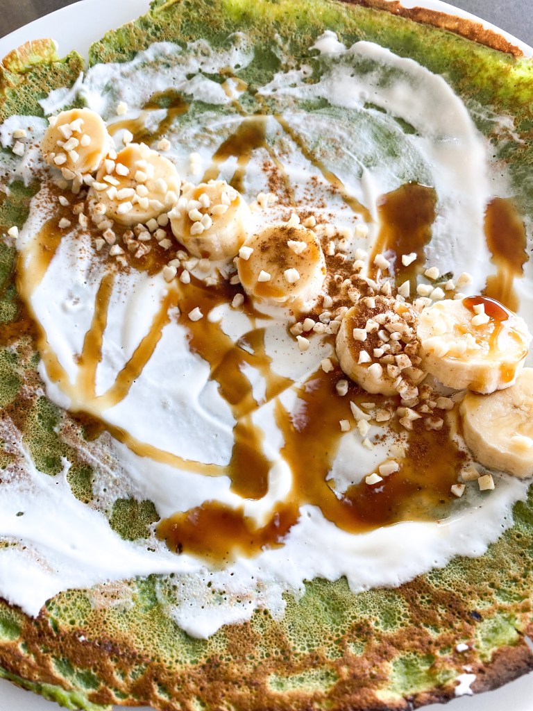 Hotovou palačinku potřeme jogurtem, nakrájíme na plátky banán, přidáme oříšky dle vlastní preference (my rádi mandle), skořici a lehce datlový sirup. Zabalíme do ruličky, přidáme navrch lehce datlový med, lesní ovoce nebo ořechy.