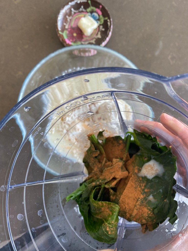 Čerstvé špenátové listy si dobře omyjeme teplou vodou, odstraníme stonky a necháme 5 minut v páře. Takto spařené listy dáme do mixéru spolu s datlovým sirupem a smetanou, skořicí a chia semínky. MIXUJEME cca 2 minuty.