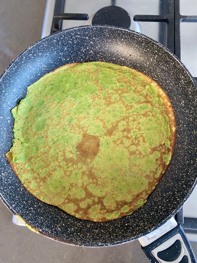 Takto připravené palačinkové těsto lijeme na pánev, kde předem rozpálíme malou kostičku domácího másla. Já preferuji palačinky tenké, tudíž liji na pánev malé množství těsta.
