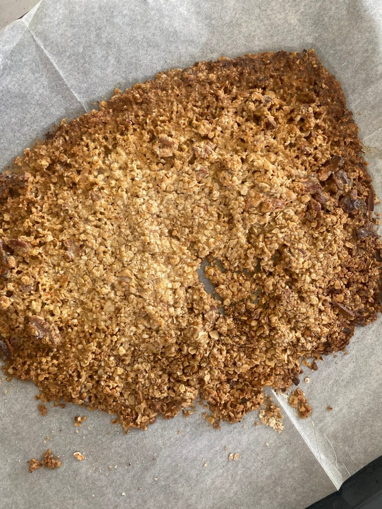 Smícháme dohromady mouku, vločky a ořechy v prstech nalámeme nadrobno. Přidáme plátky másla, které je tuhé a připravíme posypku, vše dobře v rukách prohněteme a rozprostřeme na plech. Tenká vrstva se peče na 180-200 stupňů Celsia cca 15-20 minut (dozlatova). Necháme odstát a vychladnout po upečení.